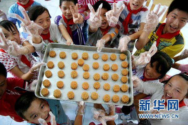 9月19日,在安徽省含山縣陶廠鎮留守兒童活動中心,孩子們展示自制的月餅。