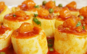 這是一道淮揚風格的菜式,首先用雞湯與豆漿釀制出風味別具的秘制豆腐,然后用湯匙做出琵琶造型備用。將大閘蟹蒸熟后,師傅們會手工剔取其蟹膏、蟹肉、蟹黃,用花雕酒、雞油、蔥、姜等配料精心炒制成蟹粉,然后再與豆腐燴在一起即可。
