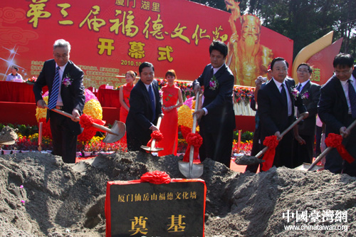 湖里區委書記李棟梁、福建省海峽文化研究會會長楊華基、臺灣寺廟金蘭會會長王增榮、新加坡道家總會會長陳添來、廈門市政協副主席陳昌生先后在開幕式上致辭。海峽兩岸關系協會副會長張銘清宣布第三屆福德文化節開幕并邀請在場嘉賓共同推動啟動桿啟動開幕,F場的嘉賓為福德文化墻和海峽兩岸非物質文化遺產(仙岳山)展示中心項目奠基儀式培土。