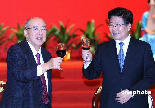 第五屆兩岸經(jīng)貿(mào)文化論壇7月11日在長(zhǎng)沙開(kāi)幕,當(dāng)晚,東道主湖南省委舉行晚宴招待論壇嘉賓。圖為中國(guó)國(guó)民黨主席吳伯雄(左)與中共湖南省委書(shū)記張春賢共同舉杯慶祝論壇開(kāi)幕。 中新社發(fā) 宋吉河 攝