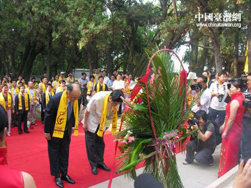 程建人與汪志剛代表兩岸文化界人士向黃帝陵敬獻花籃。(中國臺灣網 蕪同 攝)