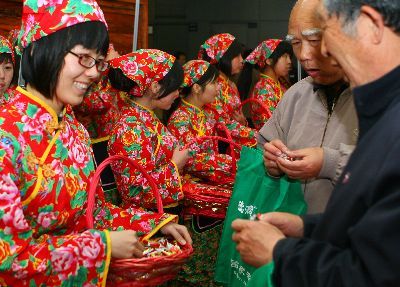 身著艷麗民族服飾的女孩請人們品嘗美酒