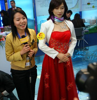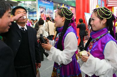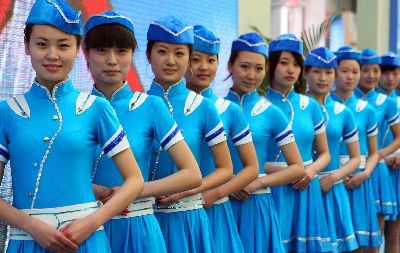展位前的禮儀小姐引人注目。本組圖片由記者侯智拍攝