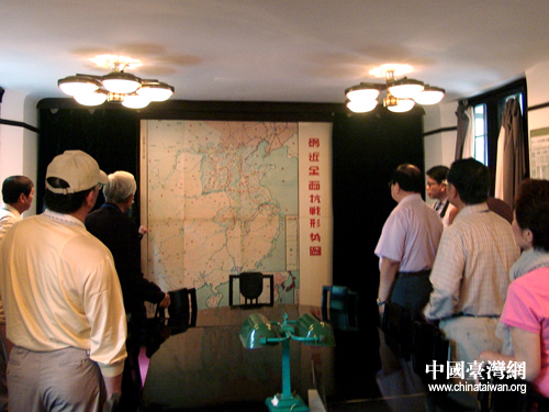 兩岸學(xué)者在抗戰(zhàn)時期蔣介石辦公地云岫樓“全面抗戰(zhàn)形勢圖”前駐足觀看