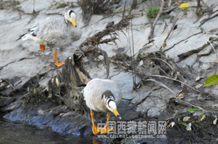 圖為兩只斑頭雁在覓食。