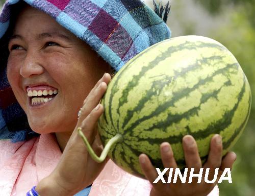 資料圖片:西藏日喀則農民喜收西瓜(2007年6月15日攝)。新華社記者 普布扎西 攝