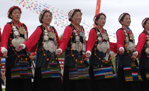 資料圖片:2007年8月26日,西藏日喀則農民表演當地民間舞蹈。當日上午,日喀則地區第七屆珠峰旅游文化節在日喀則市扎寺文化廣場開幕。 新華社記者 索朗羅布攝