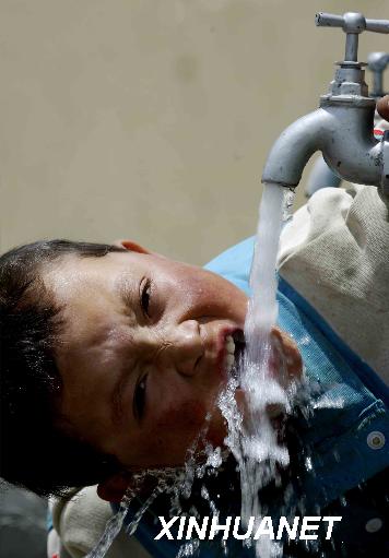 資料圖片:一名西藏日喀則薩迦縣的藏族孩子在喝水(2007年6月16日攝)。新華社記者 普布扎西攝
