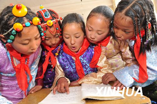 資料圖片:3月26日,昌都地區(qū)實驗小學(xué)學(xué)生嘎松曲西(中)與同學(xué)們一起念課文。新華社記者 何俊昌 攝