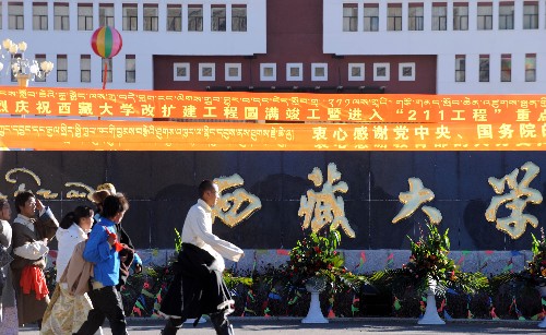 資料圖片:2008年12月16日,幾名西藏大學(xué)學(xué)生從新校區(qū)大門前走過。新華社記者 格桑達瓦 攝