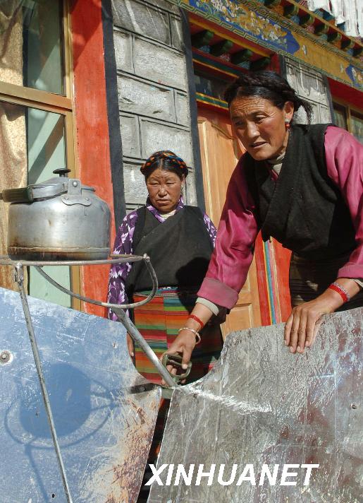資料圖片:2007年12月11日,西藏江孜縣達孜鄉(xiāng)農(nóng)民邊巴(右)正在用太陽灶燒水。 新華社記者 索朗羅布 攝