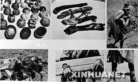 左上:農(nóng)奴主用被他們殘害的勞動(dòng)人民的頭蓋骨做成的碗;中上:一些已經(jīng)風(fēng)干變黑的被害者的手臂;中下:農(nóng)奴主摧殘農(nóng)奴和奴隸的刑具;左下:農(nóng)奴益西親沛服勞役回來(lái)后疲乏不堪,和狗一起席地而臥;右上:農(nóng)奴主外出時(shí),強(qiáng)迫農(nóng)奴像牛馬一樣背著他們走;右下:農(nóng)奴主摧殘農(nóng)奴和奴隸的刑具。