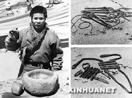 左圖為被挖去雙眼的農(nóng)奴格達(dá)在民主改革中控訴農(nóng)奴主的罪行:農(nóng)奴主將沉重的石帽戴在農(nóng)奴頭上,用石頭敲擊將眼珠擠壓出來(lái),再用利刀把眼珠剜下。右上為鞭笞人的法鞭,右下為夾手指刑具。