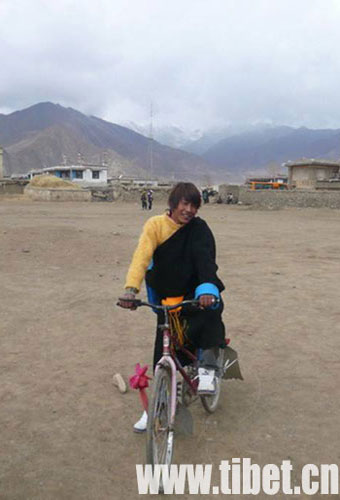 騎著自行車的藏族小伙子來到村中廣場。 攝影:曲曉麗