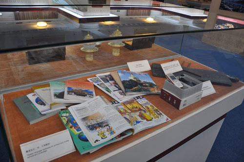 資料圖片:圖為《西藏民主改革50年大型展覽》第三展區(qū)展出的反映西藏藏語文推廣的實(shí)物,包括藏語文大、中、小學(xué)教材,藏文出版物,帶有藏文功能的移動(dòng)電話,藏文傳統(tǒng)學(xué)習(xí)工具——強(qiáng)興(寫字板)、竹筆。 新華網(wǎng) 黃銳 攝