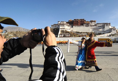 資料圖片:4月5日,游客在布達拉宮廣場上穿藏袍留影。 新華社記者 覺果 攝
