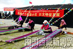 昔日荒涼的班戈縣,現已煥發出勃勃生機,人民群眾生活水平日益提高,并出現了許多牧民經濟合作組織。圖為班戈縣加瓊鎮的牧民經濟合作組織中的紡織能手正在辛勤勞作。謝偉 攝
