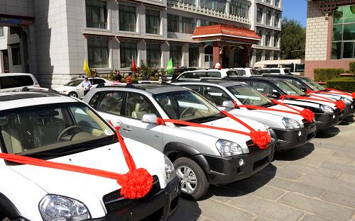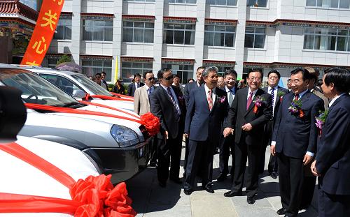 8月31日,中共中央政治局委員、全國政協(xié)副主席王剛等全國政協(xié)和西藏自治區(qū)領導觀看全國政協(xié)贈送西藏自治區(qū)各級政協(xié)的越野車。當日,全國政協(xié)向西藏自治區(qū)各級政協(xié)贈送價值1200多萬元的物資。新華社記者覺果攝