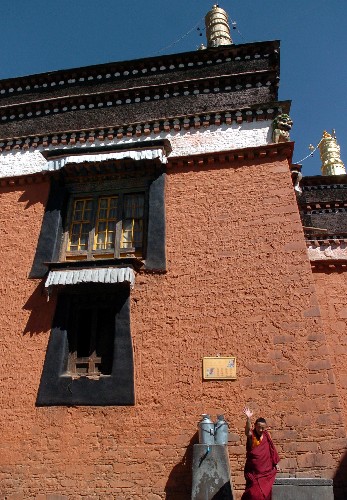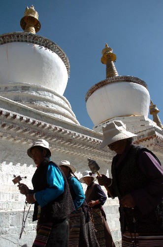 手持轉(zhuǎn)經(jīng)筒的藏族婦女經(jīng)過扎什倫布寺經(jīng)塔(2007年5月26日攝)。