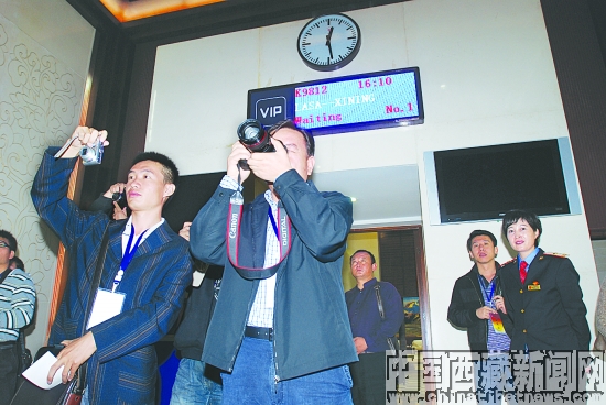 青藏鐵路成為采訪團最為感興趣的話題之一,8月31日12時左右,拉薩火車站客運運轉(zhuǎn)部工作人員接待了采訪團,介紹了拉薩火車站的運轉(zhuǎn)情況。據(jù)悉,拉薩火車站今年已發(fā)送旅客人數(shù)57萬人次。12時53分,正當采訪團準備離開之際,一聲汽笛從遠方傳來,西寧開往拉薩的臨時客運列車緩緩駛進了拉薩火車站,工作人員告訴采訪團,隨著今年暑運高峰期過去,臨客已完成今年使命,采訪團用鏡頭記錄下了這特殊時刻。