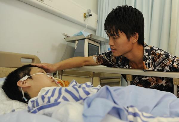 劉冬琴的丈夫范楊智一臉憔悴,他輕撫著妻子的額頭,安慰著她。面對突如其來的變故,這個27歲的貴州小伙不離不棄。連續高溫悶熱的天氣,冬琴久臥病床,卻未長一個褥瘡,這離不開丈夫的細心照顧。