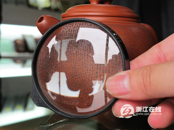 在這些紫砂壺中,最讓人稱奇的是一把茶壺上刻了3000多字。這件作品是紫砂專家、浙江省民間工藝美術(shù)大師吳偉華的杰作,而這種在紫砂上進(jìn)行微雕的技術(shù),也是他近年來的獨創(chuàng)。