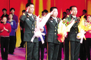 航天英雄臺上敬禮。揚子晚報記者 張 漪/攝