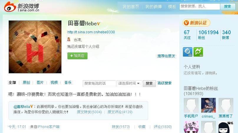 Hebe在下午五點左右更新,并轉(zhuǎn)發(fā)Ella的文字,鼓勵俞灝明要勇敢面對,以下是其微博文字:
