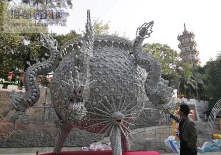 焰火首次在閩江中心順流燃放,相當(dāng)一部分曾在北京奧運(yùn)會(huì)開幕式上亮 相的萬朵禮花將點(diǎn)亮閩江夜空;66688個(gè)玻璃瓶扎成的“麒麟獻(xiàn)瑞”玻璃瓶燈組惟妙惟肖;近3萬件景德鎮(zhèn)瓷器捆扎而成的“盛世太平鼎”陶瓷燈,氣勢磅礴……第七屆“兩馬同春鬧元宵”將于正月十四晚,在福州馬尾江濱東大道馬江渡廣場舉行開幕式,當(dāng)晚2.5萬發(fā)焰火將持續(xù)燃放40分鐘。昨日,記者提前往馬尾探訪今年大型燈會(huì)的亮點(diǎn)。